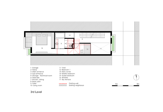 ตามความต้องการของพวกเขาโปรแกรมที่ค่อนข้างง่าย: โรงรถ (2 คัน), ห้องครัวบนชั้น 1 ห้องนอน (สำหรับแม่) และห้องนั่งเล่นบนชั้น 2, ห้องนอนบนชั้น 3, ห้องพักขนาดเล็กบนท้องฟ้า ระเบียงและห้องพระ บนชั้น 4 ... แต่พวกเขาต้องการสถาปนิกที่มุ่งเน้นไปที่การสร้างพื้นที่สาธารณะ.