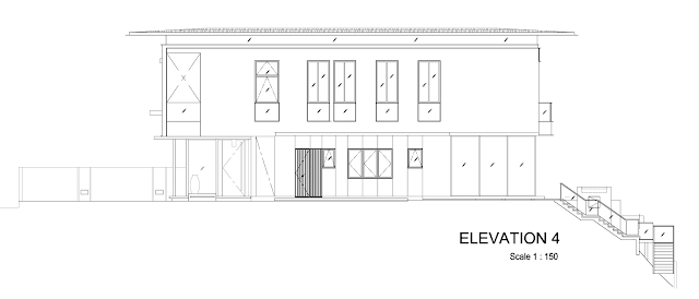 เจาะพื้นผิว interspersedly คือชุดของหน้าต่างขนาดแตกต่างกัน ซึ่งบ้านตัวตนสนุกสนานชายคาขยายให้ร่มเงาเช่นเดียวกับครั้งที่เข้าดูการควบคุมจากภายนอก.
