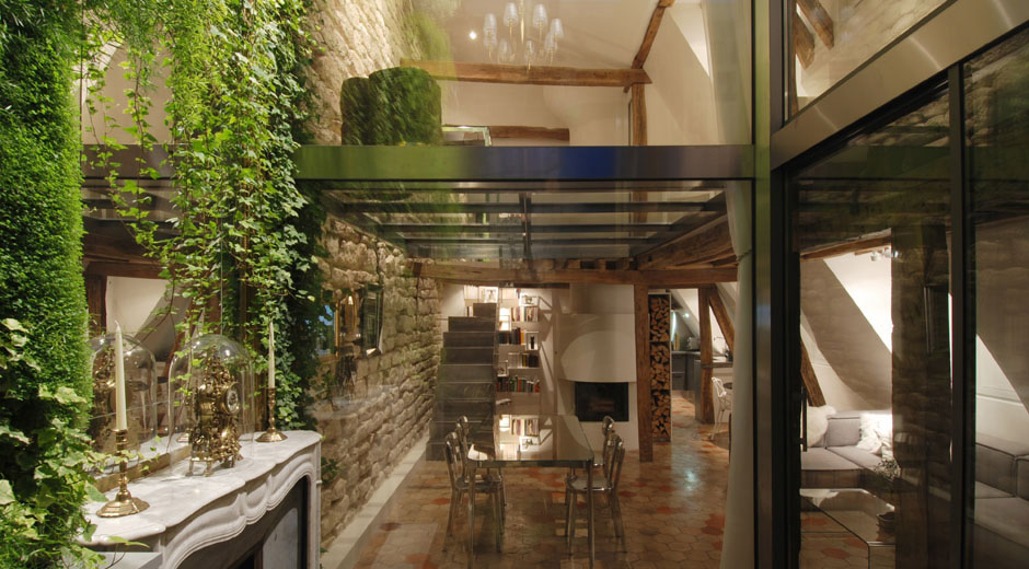 Michael Herrman, หลักของสตูดิโอ Ateliers Michael Herrman อพาร์ตเมนต์เพล็กซ์เพิ่งปรับปรุงใหม่ในอาคารช่วงปลายศตวรรษที่ 18 สำหรับเขาและครอบครัวของเขา ตั้งอยู่ในเขตเทศบาลที่แปดของกรุงปารีส, ฝรั่งเศส, ขณะนี้ 1,500 ตารางฟุต 3 ห้องนอนมีพื้นกระจกที่ชัดเจนบนพื้นที่รับประทานอาหารกลางวันที่จะนำไปสู่ทั้งระดับ.